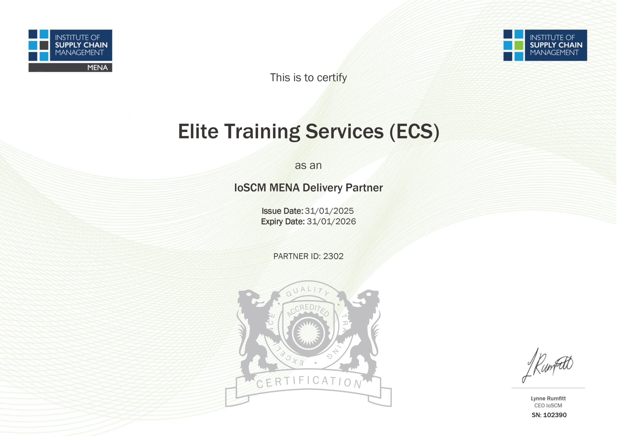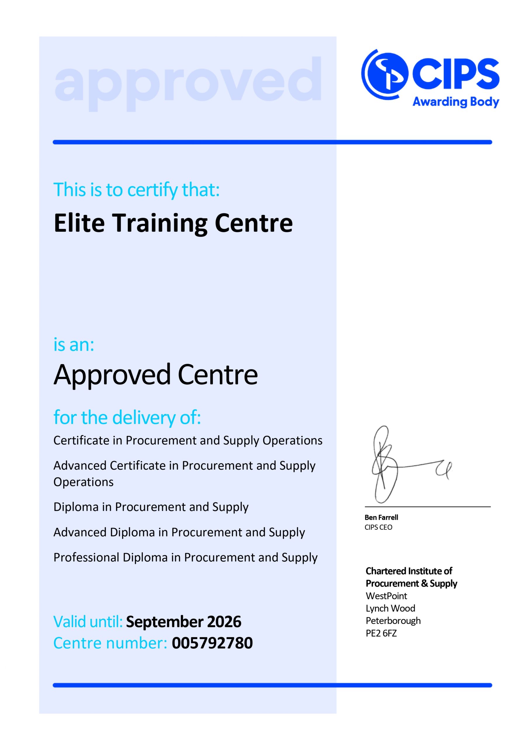 In addition, the center is accredited by the Chartered Institute of Procurement and Supply (CIPS) as an approved training and examination center, demonstrating compliance with internationally recognized professional standards.